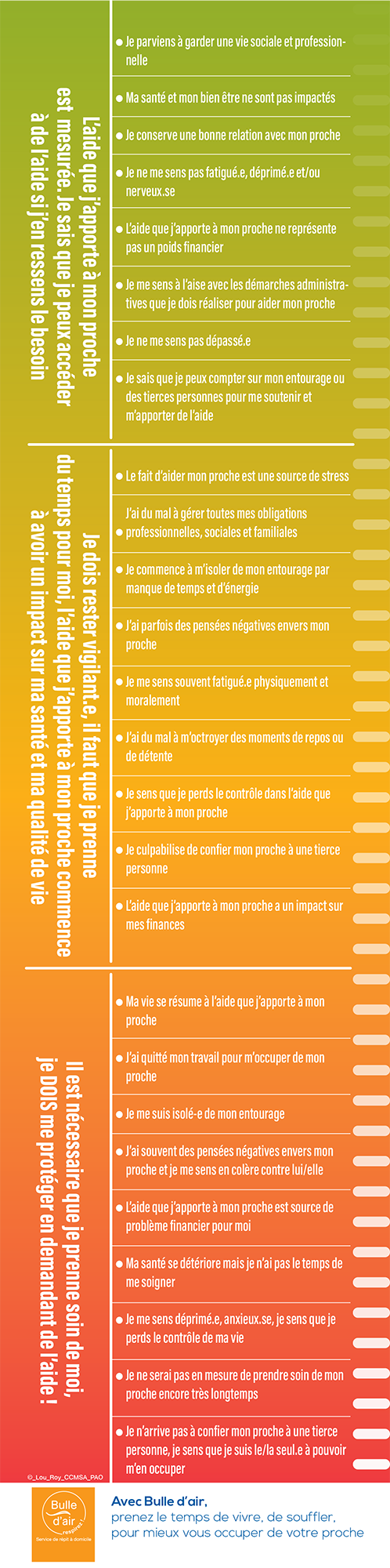 Grâce à l’Echelle de l’aidant, prenez quelques minutes pour prendre conscience de votre investissement auprès de la personne que vous aidez. En progressant sur cet outil, nous vous aidons à mesurer votre état d’épuisement.