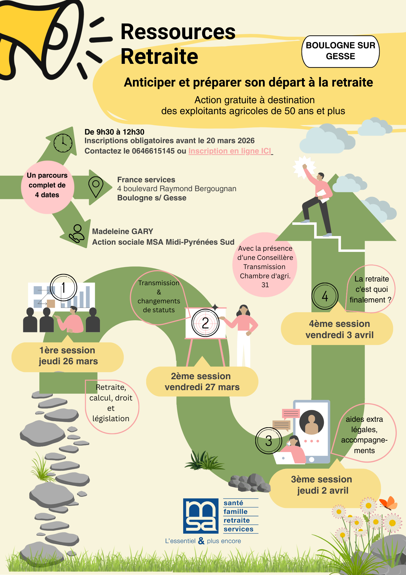 A Boulogne sur Gesse. La MSA Midi-Pyrénées Sud propose à ses ressortissants non-salariés agricoles de plus de 50 ans une action collective pour les aider à anticiper et préparer leur départ à la retraite. Gratuite et ouverte sur inscription, cette action permet aux participants de mieux comprendre leurs droits, d’anticiper les démarches à engager et de commencer à réfléchir à l’après, dans un cadre d’échange et d’information.
